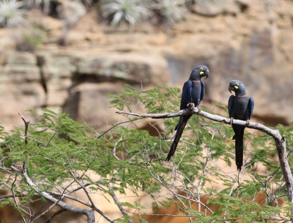 A pair of Lear's macaws in one of their habitats in the semi-arid Caatinga region of Brazil. The low vegetation may be why the birds perch on power poles (photo: Erica Pacífico/Unicamp).