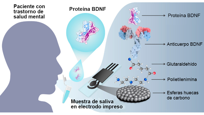 El electrodo de trabajo fue modificado con nanoesferas de carbono. Se le aplicó una capa de dos compuestos químicos —polietilenimina y glutaraldehído— para aumentar la sensibilidad y actuar como matriz de inmovilización del anticuerpo de captura específico de BDNF (anti-BDNF). Para evitar otros tipos de interacción, se añadió una capa reactiva de etanolamina.