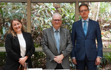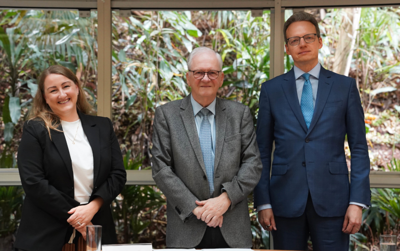 Maiju Gyran, secretária-geral do Conselho de Pesquisa da Finlândia (RCF), Marco Antonio Zago, presidente da FAPESP, e Kari Puurunen, cônsul da Finlândia em São Paulo (foto: Daniel Antônio/Agência FAPESP)