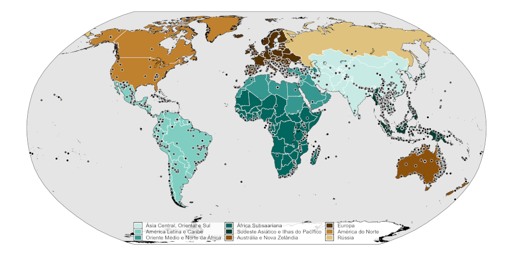 Localidades onde as espécies de moluscos terrestres foram descobertas entre 2003 e 2022. As regiões geopolíticas em tons esverdeados contêm países tipicamente associados ao Sul Global, enquanto as de tons marrons indicam os do Norte Global (imagem: Mario Moura/UFPB)