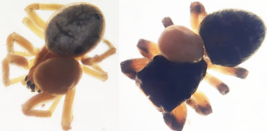 Nova espécie Araneothrombium brasiliensis fixada a aranhas das famílias Araneidae (esquerda) e Salticidae (direita) (imagens: Ricardo Bassini-Silva)