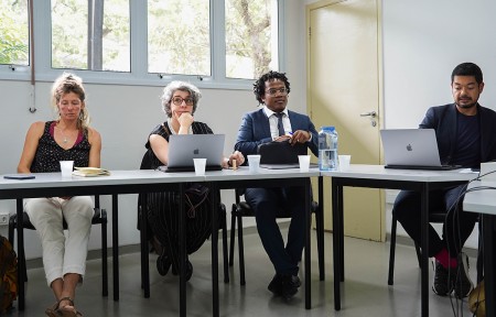 Nastassja Martin, professora de Habitabilidade da Terra e Transições Justas na Université Paris 1 Panthéon-Sorbonne, Nadia Belaidi, eco-antropóloga e editora-chefe da revista Droit et Cultures, Alex Alexis, doutorando em direito comparado pela Université Paris 1 Panthéon-Sorbonne e pela Université de Montréal, e Vitor Ido, professor de direito comercial da FD-USP (foto: Daniel Antônio/Agência FAPESP)