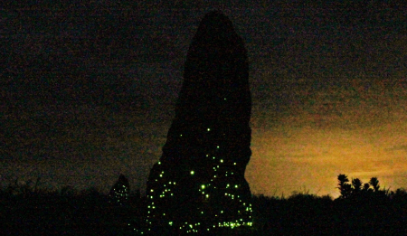 Un termitero luminoso en el Parque Nacional das Emas, en el estado de Goiás: las larvas de cocuyos de la especie Pyrearinus termitilluminans generan un espectáculo que se restringe al parque, una isla en el océano del monocultivo (foto: Vadim Viviani)