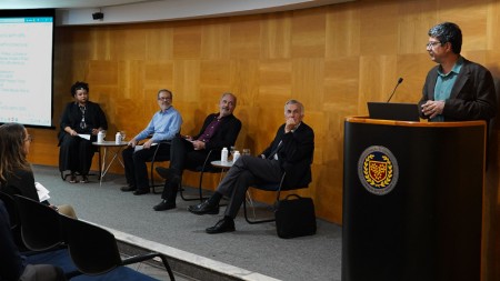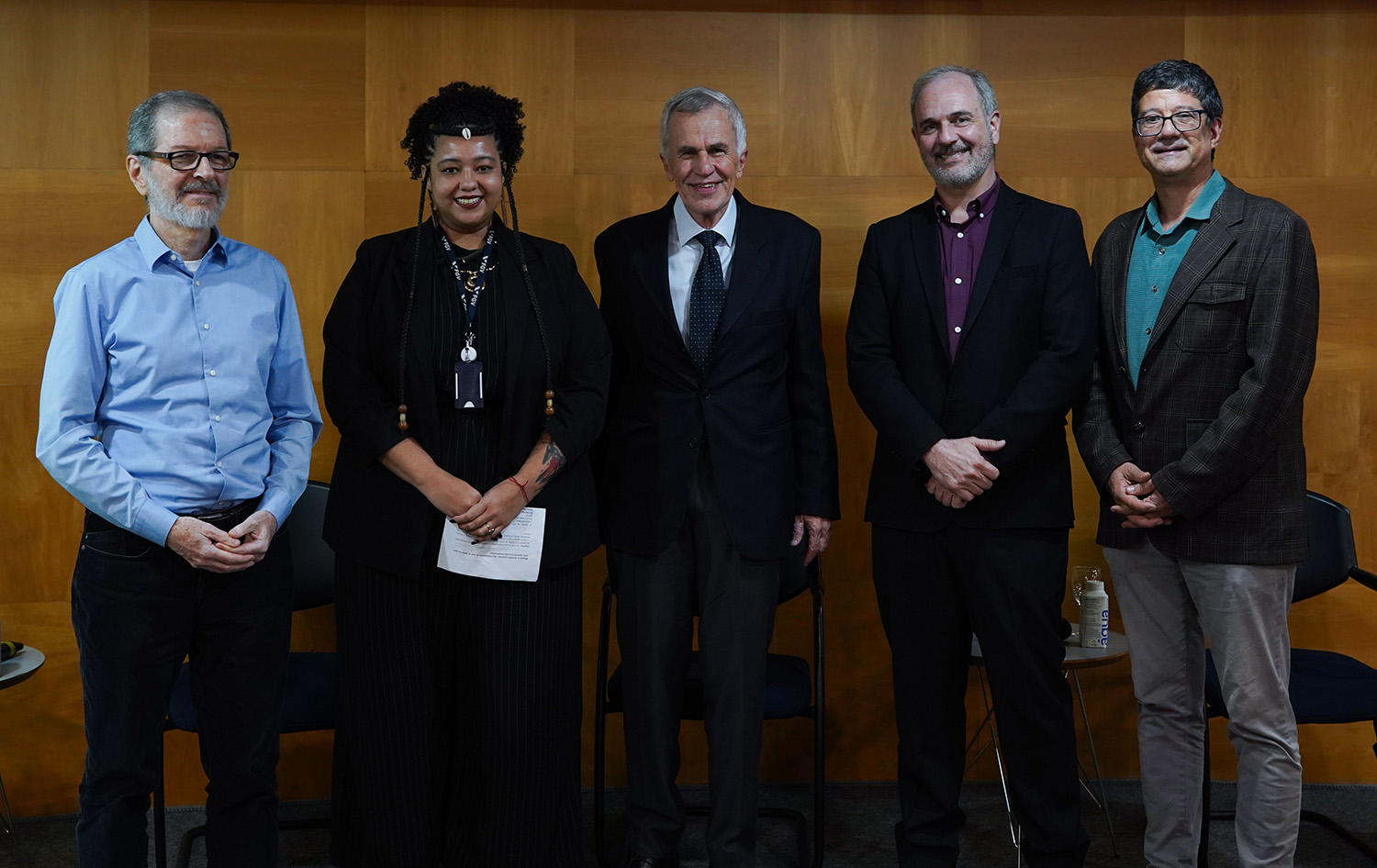 Da esquerda para a direita: Thomas Wood Jr, coordenador de Pesquisa da FGV, Tamara Marques, coordenadora de Parcerias Internacionais da FGV, Luiz Nunes de Oliveira, gestor do Programa CEPID FAPESP, Tales Andreassi, vice-diretor da EAESP-FGV, e José Antônio Puppim de Oliveira, coordenador do novo CEPID (foto: Daniel Antônio/Agência FAPESP)