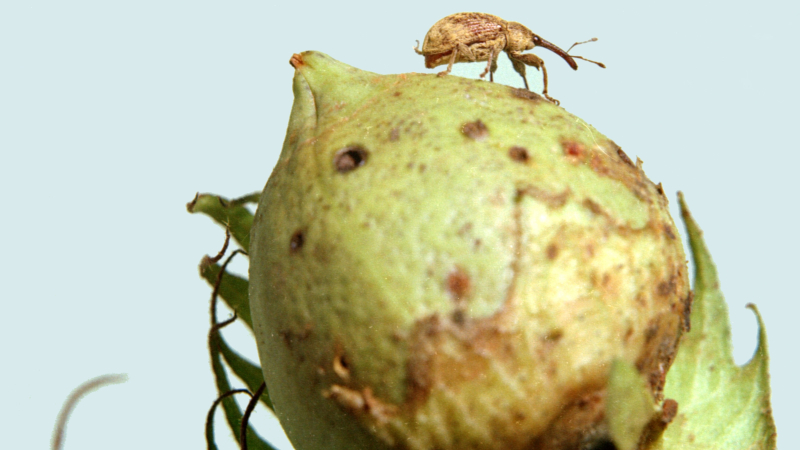 A female boll weevil (Anthonomus grandis) feeds on and lays eggs in the flower bud of a cotton plant, causing the bud to abort and impairing fiber quality and yield (image: Clemson University/Wikimedia Commons)