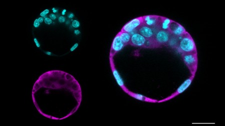 Blastocisto de ratón (estructura muy semejante a la humana). En magenta aparece una amplia expresión de la proteína STIP1. Los núcleos celulares están teñidos en azul. El blastocisto representa un momento único del desarrollo, cuando el embrión forma su primera estructura organizada (imagen: Lopes et al.)