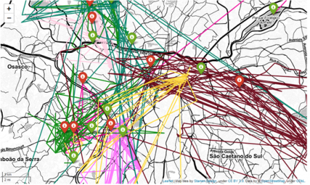 Sequence of inferred locations (trajectories) of mobile phone users, where each color represents a different individual. This data was used in a study examining mobility variability among São Paulo favela residents (image: Matheus Henrique Cunha Barboza)