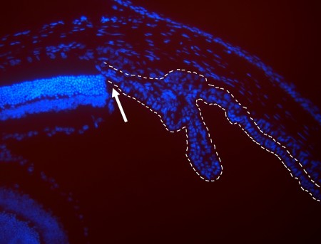 Imagem visualizada em microscópio de fluorescência mostra núcleos de células da retina (à esq. da seta) e do epitélio ciliar ( à dir. da seta) de camundongo (imagem: Dânia Emi Hamassaki)