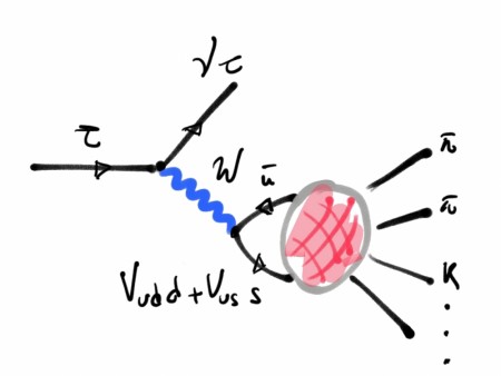 Esquema do decaimento do lépton tau feito pelo pesquisador. O tau decai em um neutrino e em um bóson W (em azul). Os quarks são produzidos pelo W e interagem fortemente (bolha rosa), formando os hádrons que são detectados (pions e kaons). O processo possibilita determinar um valor para a constante de acoplamento forte.