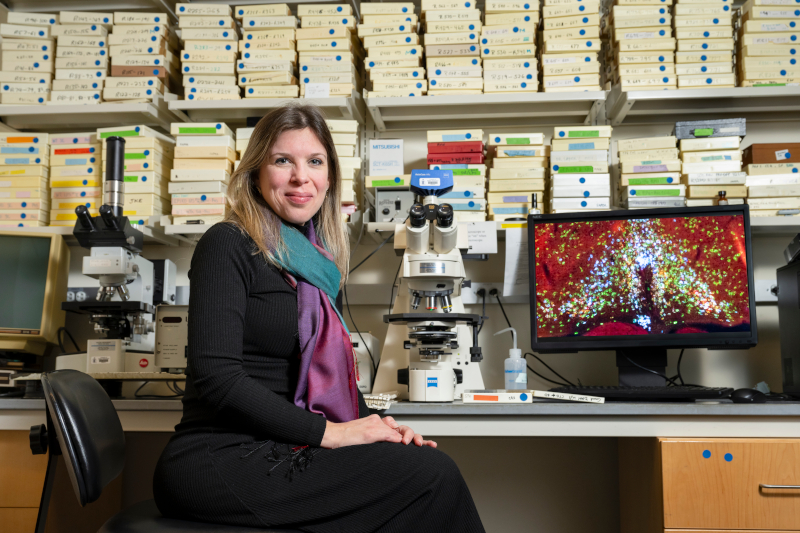 Natália Machado em seu laboratório na Escola de Medicina de Harvard (foto: Anna Olivella/ Harvard Brain Science Initiative)