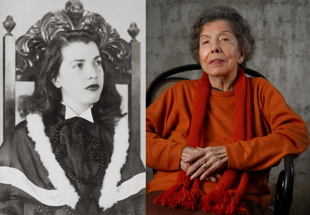 Bacharel em matemática pela PUC-Campinas, em 1947; em 2022, retratada para a capa do livro Com a palavra, Elza Berquó (fotos: arquivo pessoal e Chico Max)