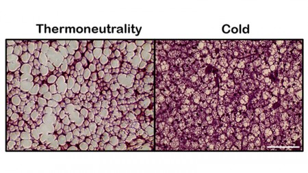 Sections of brown adipose tissue from mice kept at thermoneutrality or cold for 14 days, revealing tissue remodeling at different temperatures (image: Osvaldo Rodrigues Pereira Júnior et al./American Journal of Physiology-Cell Physiology)